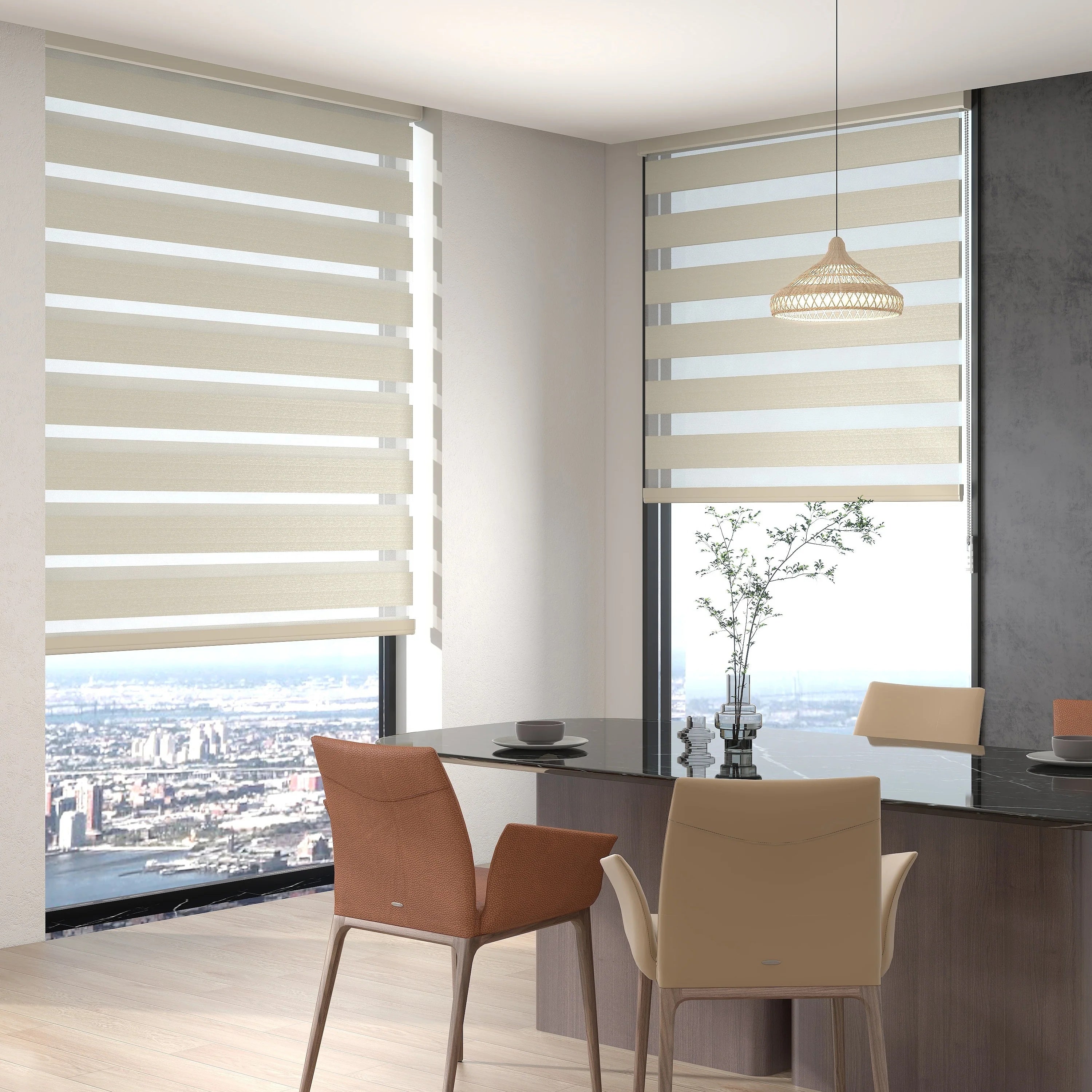 Zebra blinds, also known as dual-layered blinds, are a versatile and stylish addition to any home. These blinds feature an innovative design that combines alternating sheer and solid fabric stripes, allowing for precise light control and privacy options. Innovative Light Control: Zebra blinds offer a unique dual-layered design, featuring alternating sheer and solid fabric stripes. By adjusting the alignment of these stripes, you can easily control the amount of natural light entering the room and achieve the desired level of privacy. When the solid stripes overlap, the blinds provide full privacy and light blockage, while aligning the sheer stripes allows natural light to filter through, creating a softly illuminated environment. Modern and Versatile Design: The sleek and modern look of zebra blinds complements a wide range of interior decor styles, from contemporary to minimalist. They are perfect for various rooms in your home, including the living room, bedroom, kitchen, and office, adding a touch of elegance and sophistication. Easy to Install and Maintain: Crafted from high-quality materials, zebra blinds are durable and easy to maintain. The fabric can be easily cleaned with a duster or a damp cloth, ensuring they remain fresh and new-looking. Enhanced Privacy and Light Control: With zebra blinds, you can achieve the perfect balance of privacy and light control. The adjustable design allows you to customize the level of visibility and brightness in your space, making them ideal for any time of day and any room in your home. Versatile and Functional: Whether you're looking to enhance the aesthetic appeal of your home, improve light control, or increase privacy, zebra blinds are an excellent choice. Their practical functionality and stylish appearance make them a valuable addition to any living space.